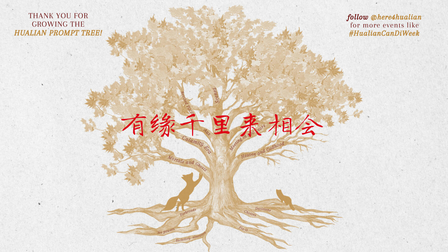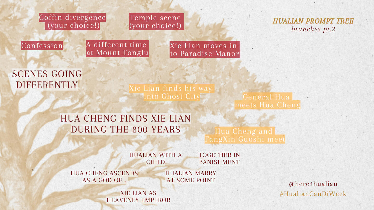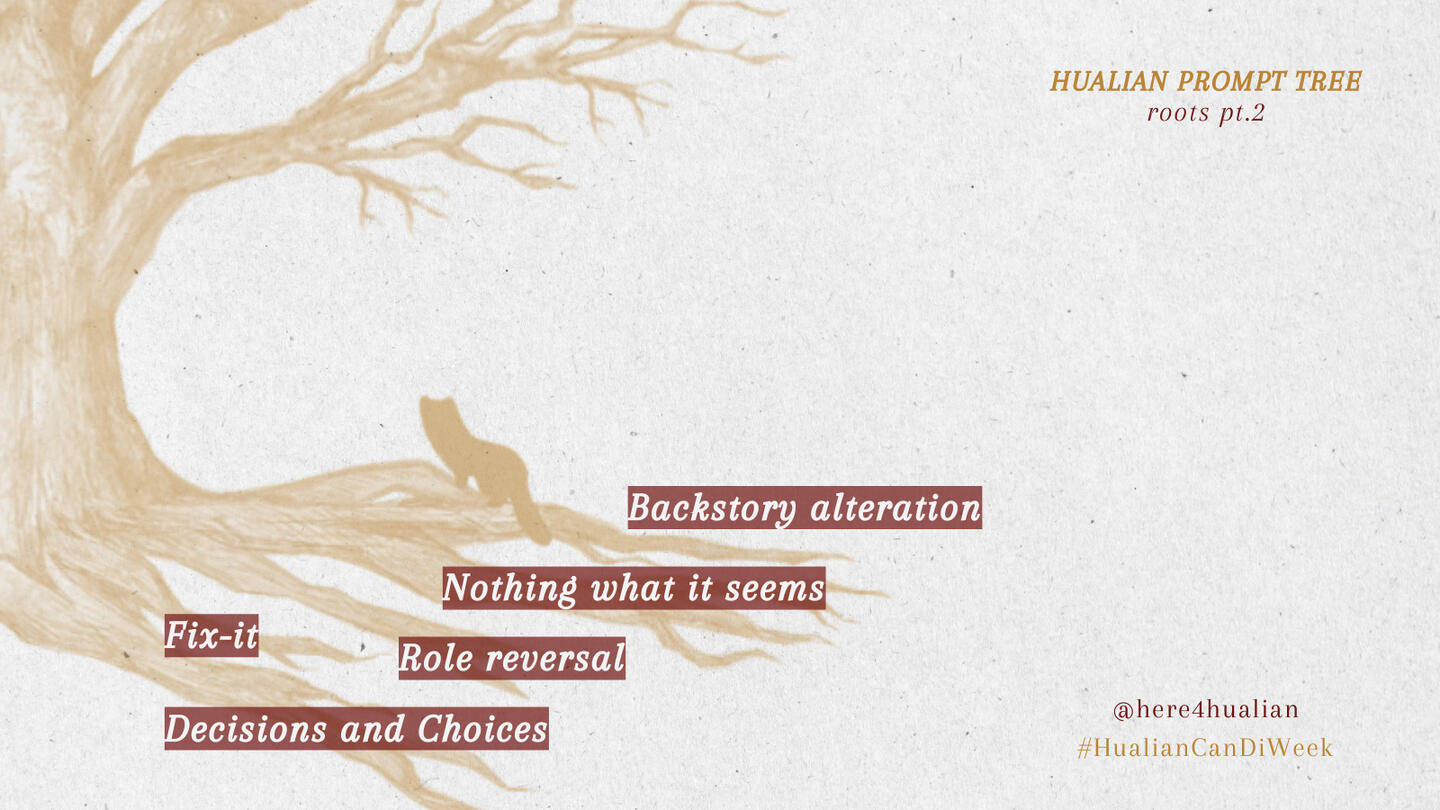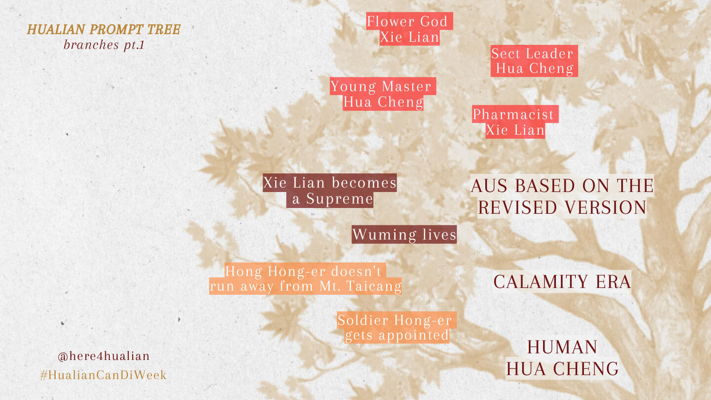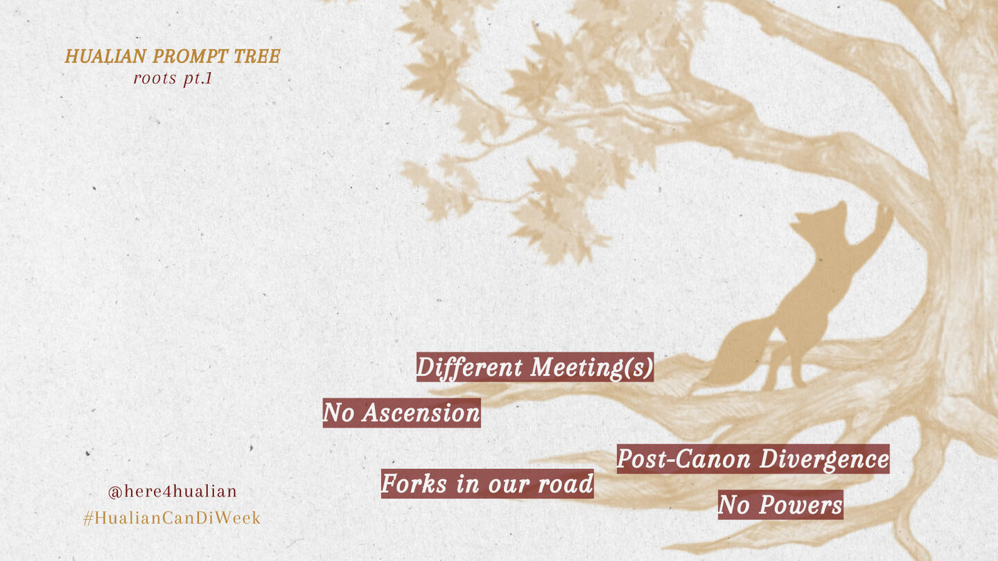 The roots represent the common tropes that can be associated with Canon Divergent AUs. The branches of the tree represent specific events in HuaLian’s story that can serve as points of divergence, but in the end, they're all part of the same HuaLian tree.No need to do all days, all prompts, and you can merge or ignore them to your heart’s content.